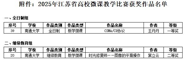 根据《关于举办2025年江苏省高校微课教学比赛的通知》(苏高教信研(2025)5号),经学校遴选报送、专家在线评审、会议复核和在线公示,共评审出教学微课和实录微课两类获奖作品共929项(不含军事院校),其中全日制组一等奖作品125项,二等奖作品274项,三等奖作品447项;继续教育组一等奖作品12项,二等奖作品28项,三等奖作品43项。